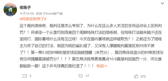 全运会女团小组赛,河北队VS上海队的一场关键比赛,当时河北队已经大比分2-1领先上海队,何卓佳VS陈熠是第四盘,只要何卓佳赢球就直接带走比赛,两人2-2,决胜局何卓佳10-9赛点,结果何卓佳因为发球违规被罚分,何卓佳、杨导、孙颖莎都非常不满。
