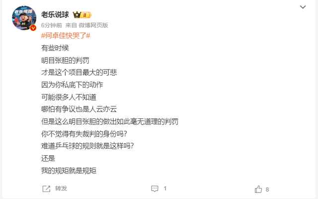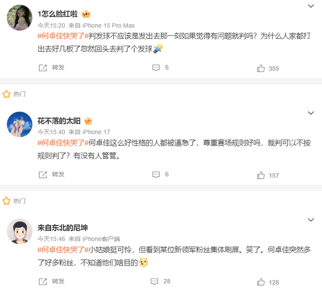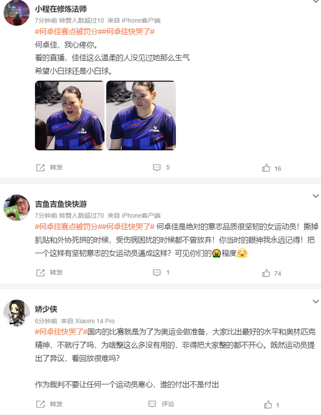 这场比赛裁判的尺度引发了巨大的热议,因为何卓佳赛点球被罚分裁判拒绝看回放,罚分就直接罚分了。