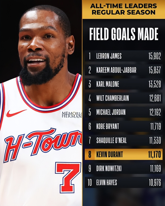 杜兰特上半场命中三分后,生涯投篮命中数达到11170个,超越诺维茨基(11169个),升至NBA历史第8位。他的下一个超越目标是排在第7的奥尼尔(11330个)。