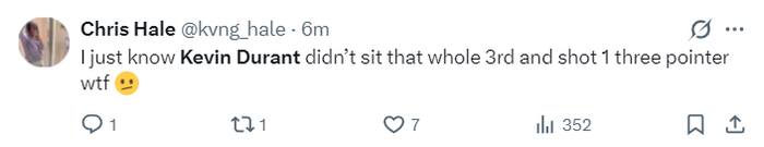 第三节杜兰特还是打无球,他本人要球的欲望也不高,感觉杜兰特对火箭的竞争性略显失望,单节10分钟只有2次出手单节拿到3分2助攻,而申京单节出手8次只命中2个,杜兰特三节15分5助攻4篮板。火箭球迷:我不理解,第三节为什么KD只有一个出手。