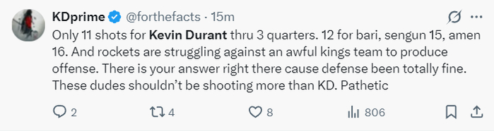 休媒:三节打完杜兰特11出手,申京15次,阿门16次,小贾12次,火箭与一支糟糕的国王打对攻还落下风的原因找到了。这些人的出手比KD还多太可悲了。