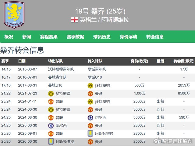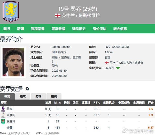 桑乔现年25岁,当打之年,身价2500万欧元,在曼联的周薪为20万英镑,现有合同至本赛季结束,桑乔为了履行完高薪合同,今年夏窗拒绝了多家更合适的俱乐部,从而租借加盟阿斯顿维拉一个赛季,至今各项赛事出场4次,英超替补1次,仅出场8分钟;欧联杯出场2次,其中1次首发,出场99分钟;联赛杯首发出场1次(74分钟);合计出场181分钟,0球0助。