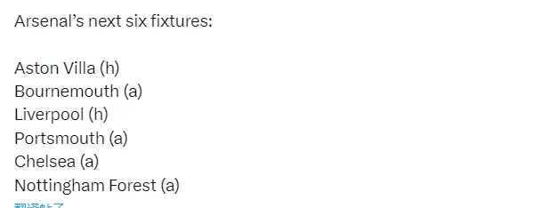 阿森纳未来6场比赛:主战维拉、客战伯恩茅斯、主战利物浦、客战朴茨茅斯、客战切尔西、客战诺丁汉森林。